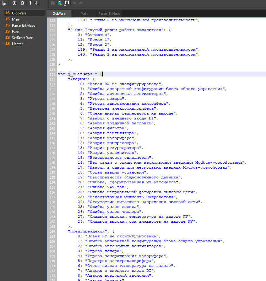 Все регистры с битовыми картами обрабатываются скриптами. Папки с такими тегами имеют в названии (БитМап). Имя виртуального тега - название ошибки (аварии, статуса).