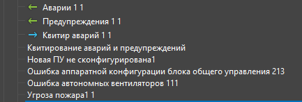 Остальные виртуальные теги из папки "Аварии и предупреждения (БитМап) 1" - это ошибки и предупреждения. Если значение тега = 0 - ошибок и предупреждений нет, тег = 1 - это предупреждение (вент установка работает), тег = 2 - это критическая ошибка (вент установка выключена)