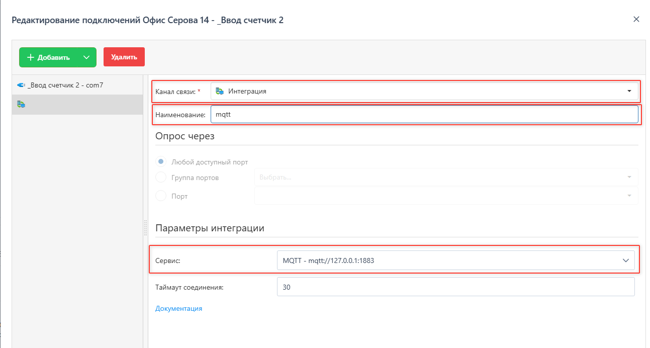 Канал связи - Интеграция, Сервис - выберите созданную Вами интеграцию с MQTT брокером. Наименование подключения - произвольное